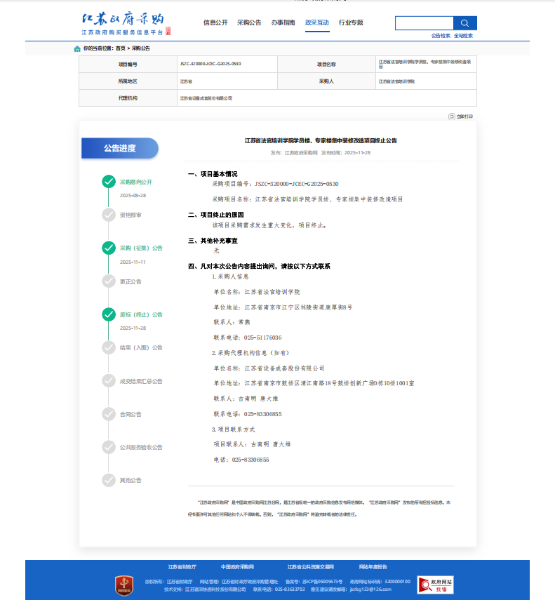 江苏省法官培训学院学员楼、专家楼集中装修改造项目终止公告